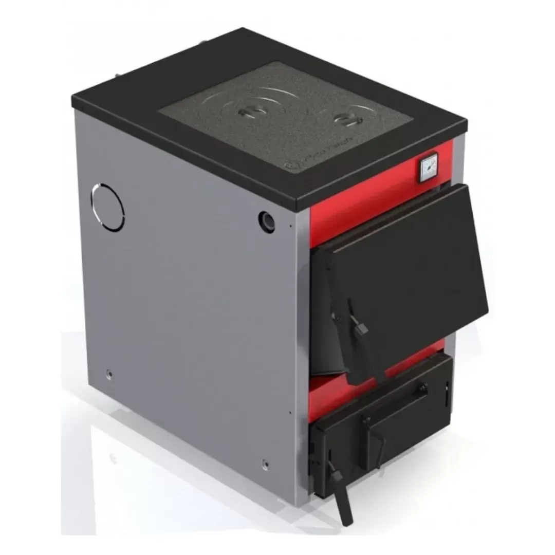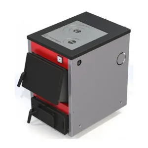 Теплообменник изготовлен из котловой стали 3 мм с чугунными колосниками и позволяет эксплуатировать котел в закрытых отопительных системах с давлением до 3 атм.