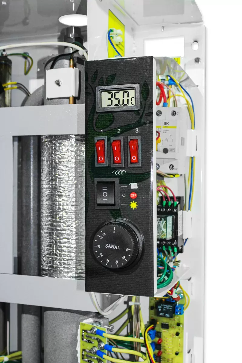 Котел оборудован нержавеющими ТЭНами, тремя степенями мощности с симисторной коммутацией ТЭНов, что обеспечивает бесшумное включение.