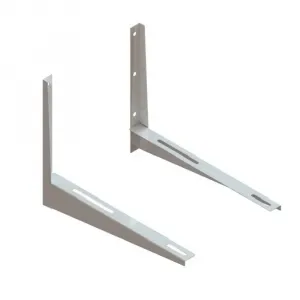 Кронштейн для крепления кондиционера представлен двумя экземплярами и предназначен для монтажа блока, размещаемого на улице. Это удобное приспособление для размещения климатического оборудования в специально обозначенном месте. В каждом изделии предусмотрены специальные отверстия, в которых располагаются крепежные элементы. Расстояние между ними можно менять исходя из размеров устанавливаемого устройства.