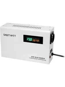 Настенный стабилизатор напряжения SMARTWATT AVR SLIM 500RW имеет удобный конструктив и улучшенные технические характеристики. Среди особенностей модели — стабилизация напряжения от 100В, компактный плоский корпус, релейное переключение при помощи микропроцессора, функция «ZeroCross», задержка на включения, расширенный дисплей индикации, возможность напольного и настенного размещения.