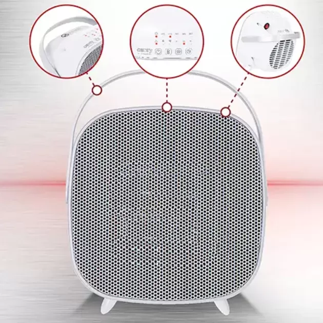 Керамический обогреватель с эффективным керамическим нагревателем. Устройство имеет таймер, который позволяет устанавливать время работы от 1 до 7 часов. На светодиодном дисплее отображается выбранная температура в диапазоне 15-35 °C и 2-й уровень мощности нагрева. Тепловентилятор греет с мощностью 1100 Вт или 1500 Вт. Защитный выключатель автоматически отключает питание в случае опрокидывания устройства, защита от перегрева. Устройство имеет функции охлаждения нагревателя и вентилятора.