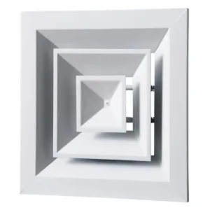 Диффузор потолочный Вентс ДП 325х325 предназначен для монтажа в поверхность подвесного потолка и используется для распределения воздуха в системах приточно-вытяжной вентиляции. Деление происходит в четыре стороны. Решетка изготовлена ??из экструдированного алюминиевого профиля. Размеры лицевой части 325х325 мм, монтажный размер патрубка 213х213 мм.