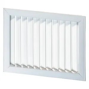 Материал - прочный пластик, цвет белый. Распределение воздуха происходит через наклонные пластины. На рисунке изображена подача приточного воздуха. Также решетка может быть использована для вытяжной системы.
