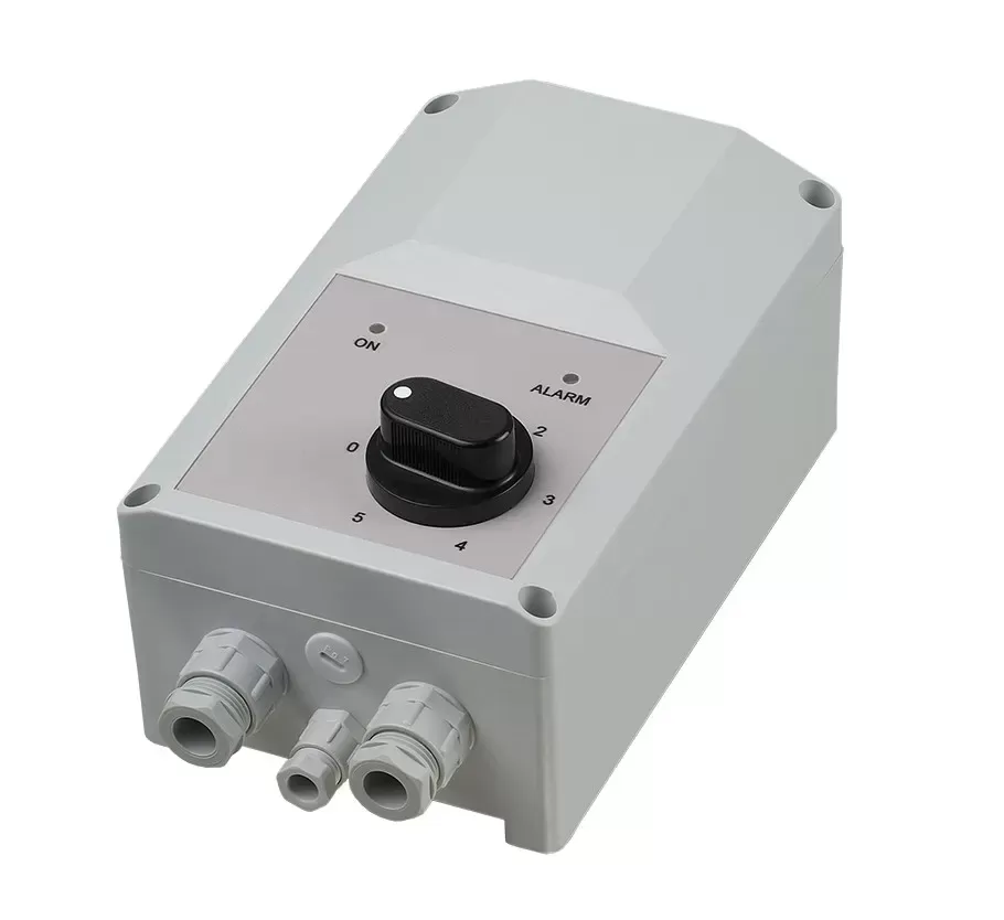 Корпус регулятора изготовлен из негорючего термопластика. Регулятор имеет пять скоростей с выходным напряжениям 90В - 150В - 200В - 280В - 400В. Регулятор оборудован ручкой переключения скоростей лампой индикации работы и сигнальной лампой, показывающей аварийную работу регулятора. Регулятор имеет встроенное устройство защиты электродвигателя, которое прекращает подачу электричества при срабатывании термоконтактов электродвигателя вентилятора. Повторное включение происходит после возвращения температуры двигателя к рабочим значениям. В качестве дополнительных функций регулятор имеет клеммы (230 В, макс. 2А) для подключения и управления внешним оборудованием (например, приводами воздушных заслонок).