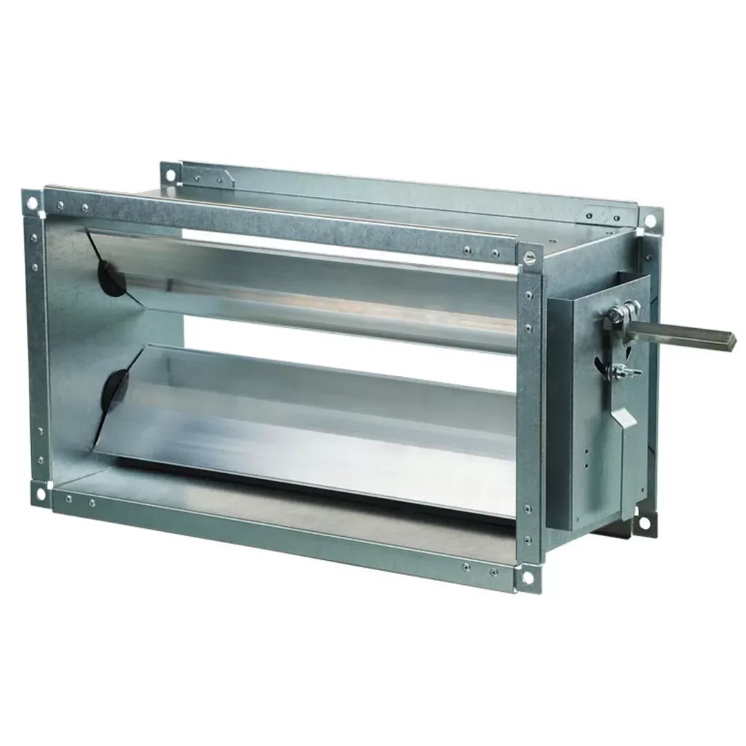 Регулятор может регулироваться вручную с помощью металлической рукоятки и фиксатора положения заслонки или с помощью электропривода. Для монтажа привода предусмотрена площадка и шток.