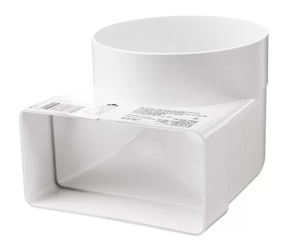 Колено для плоского и круглого воздуховода пластиковое Вентс 521 соединяет воздуховод пластиковый 55х110 мм с круглой трубой 100 мм под углом 90°. Это изделие является одним из элементом вентиляционных труб для вытяжки кухни, ванной или туалета квартиры, частного дома или коммерческого помещения. Также применяется для приточной вентиляции.