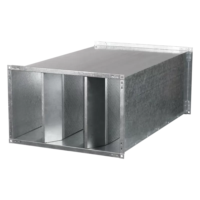 Корпус шумоглушителя и оболочки пластин изготовлены из оцинкованной стали. Пластины наполнены негорючим звукопоглощающим материалом с защитным покрытием, предотвращающим выдувание волокон.